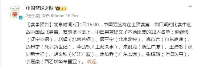 北京時間2月28日,中國籃球之隊官方公布對陣中國台北男籃的12人陣容名單,與上一場對陣日本男籃的12人陣容保持不變。至於中國台北男籃的12人陣容存在變化,即用後衛遊艾喆頂替受傷的前鋒馬建豪。中國男籃過往賽會交鋒11勝1負,需謹防重蹈2013年“馬尼拉慘案”重演。