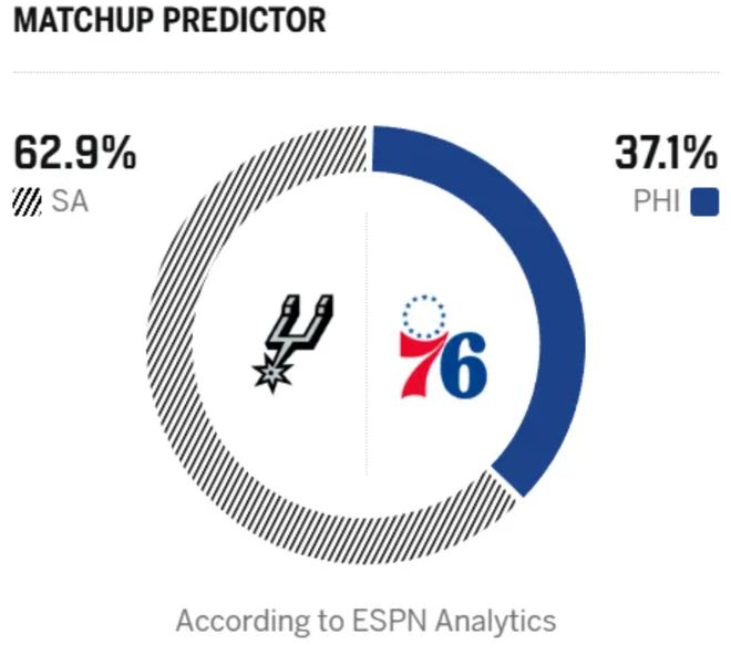 北京時間3月4日,NBA常規賽繼續進行,76人主場迎戰馬刺!馬刺上場比賽89-114慘敗尼克斯,3月開門黑,11連勝也被終結,43勝17負的戰績位列西部第二。那一戰,文班亞馬拿下25分13籃板,但三分7投僅 1 中,還出現7次失誤。馬刺整體三分手感冰涼,全場34次三分出手僅命中9球,除文班亞馬外,僅有瓦塞爾和卡斯爾得分上雙,球隊整體表現難言理想。而76人上場比賽同樣被凱爾特人終結連勝,33勝27負的戰績位列東部第六!恩比德上一場缺陣,馬克西空砍33分6助攻,埃奇庫姆拿到23分,其餘球員表現平平。德拉蒙德中規中矩貢獻10分12籃板,巴洛有14分8籃板入賬,烏布雷10投僅2中,替補席四人合計僅得14分。目前 76 人陣容深度一般,喬治被禁賽,恩比德打打停停,確實傷害球隊。此役,恩比德繼續缺陣,賽前,美媒ESPN預測本場比賽,馬刺勝率62.9%,76人勝率37.1%。